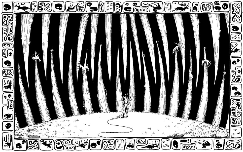 A series of five pen drawings, illustrating the Cayuse, Umatilla, and Walla Walla story of the monster that came up the river.